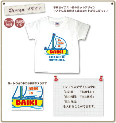 6ヶ月から10歳くらいまでのサイズ80〜150まで対応でベビー&キッズにぴったり!風を受けて海を行く手書き風のヨットのイラストと一緒にお子様の「お名前」「お誕生日」「出生時間」「出生体重」や「出生身長」も入ります。