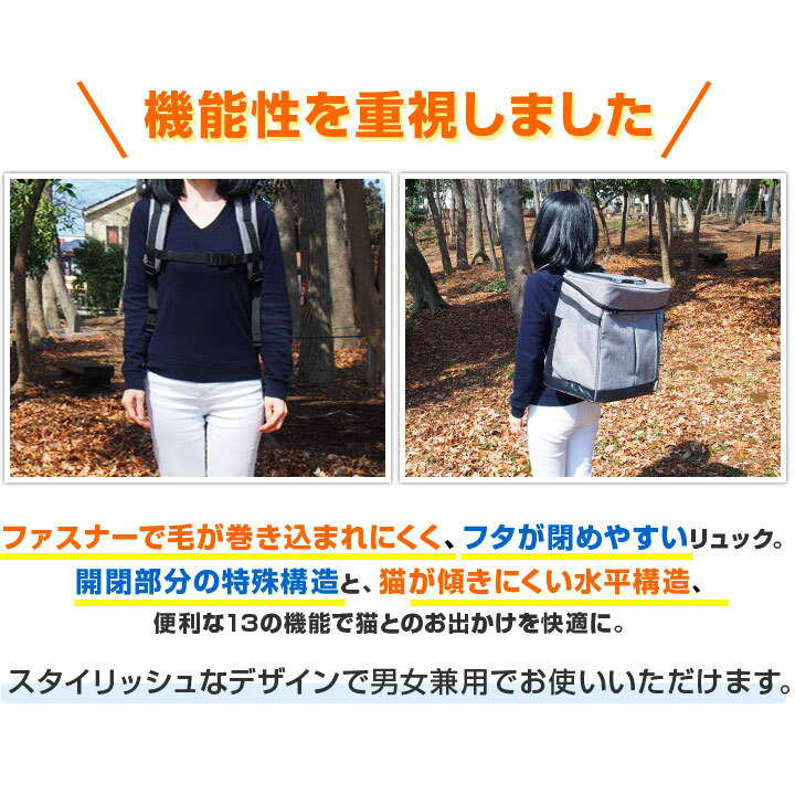 開閉部分の特殊構造と、猫が傾きにくい水平構造、便利な13の機能で猫とのお出かけを快適に。