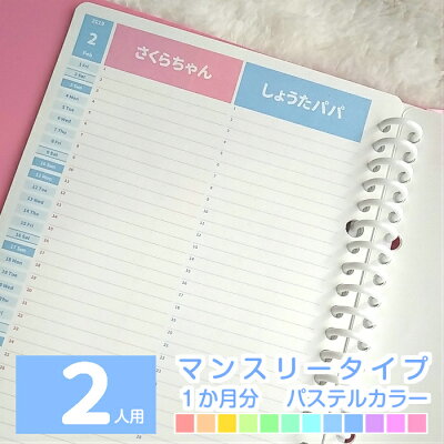 2021年 1か月分【2人のお名前入りスケジュール帳】ママ手帳 ベビー 家族の予定 ファミリーダイアリー カレンダー 手帳 2021年4月始まり/ 2021年2月始まり/他◆2人用 マンスリー パステルカラーみんなのスケジュール【ルーズリーフ / 6穴システム手帳リフィル】A5 B5 A4